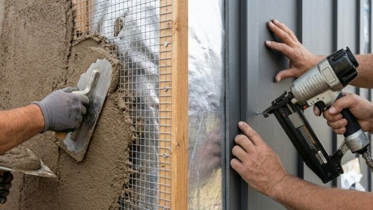 Stucco is a masonry product. It is a wet mixture of Portland cement, sand, limestone, and water. Contractors apply it by hand in multiple coats over a wire mesh or metal lath attached to your home’s exterior framing. Once it dries, it cures into a rock-hard, continuous shell. Because it is mixed and applied on-site, the quality heavily depends on the skill of the artisan wielding the trowel.